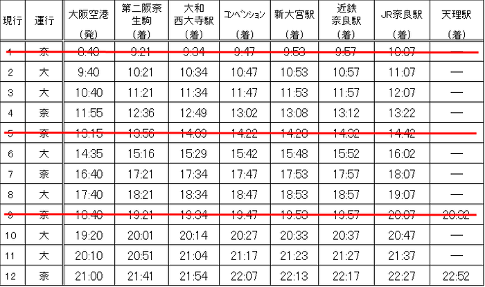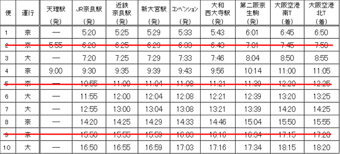 当社では、新型コロナウイルスの影響により、現在、エアポートリムジンバス大阪空港線の一部便を運休しておりますが、4月1日からの奈良県コンベンションセンターおよび大和西大寺駅南口への乗り入れ等に伴う運行時刻の変更後(2月26日にプレスリリース:別紙参照)につきましても、引き続き一部便を運休し、運行いたします。