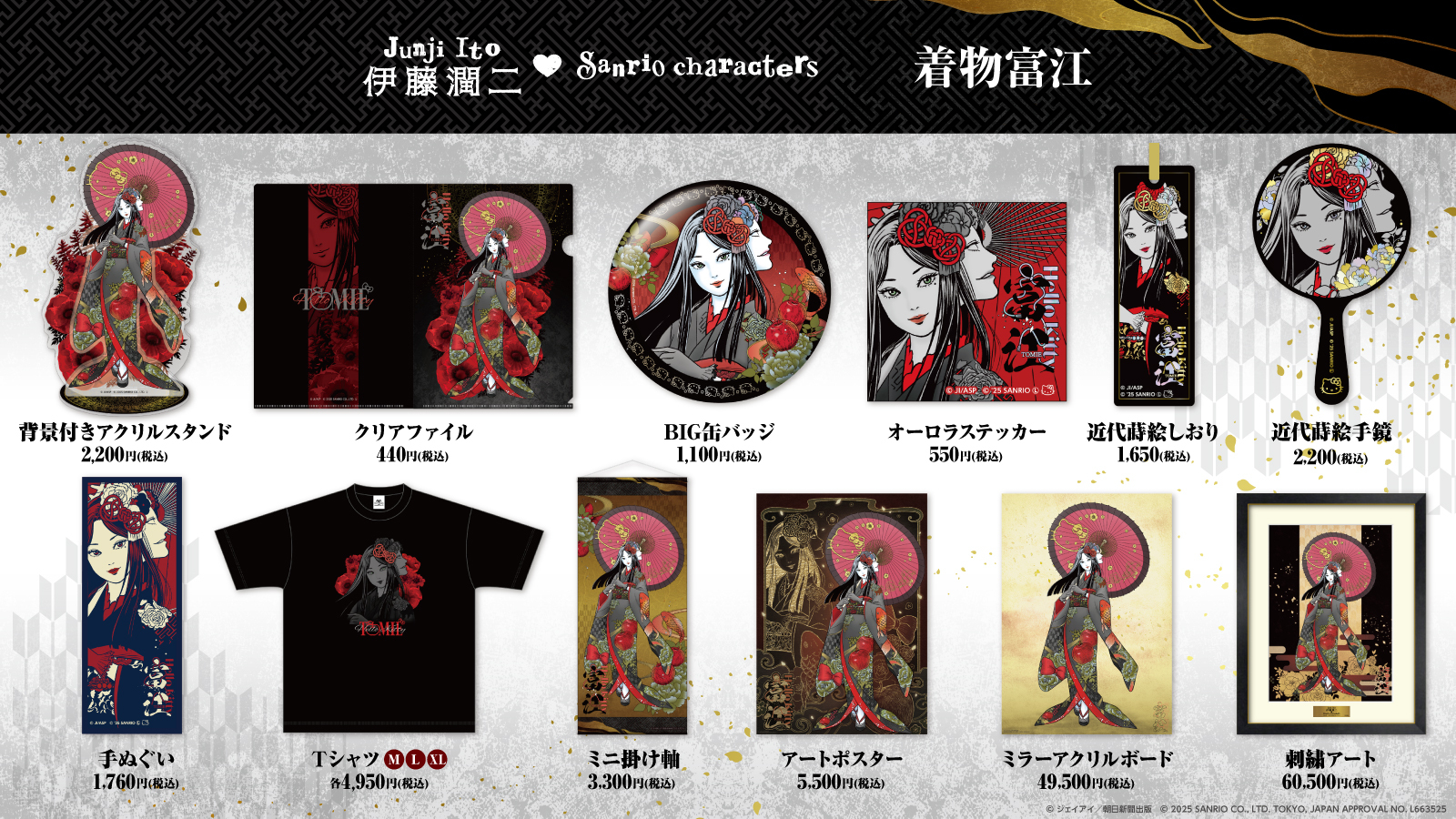 ハローキティをイメージした着物を身に纏った富江のデザイン『着物富江シリーズ』、昨年ハローキティとコラボしたギャル姿の富江は今回マイメロディ、クロミとのコラボ(『ギャル富江シリーズ』)、また伊藤潤二作品の代表的な一コマにサンリオキャラクターズが登場する『パロディシリーズ』、以上は伊藤潤二先生による描き起こしとなります。また伊藤潤二作品のキャラクターをデフォルメした『なかよしシリーズ』とサンリオキャラクターズが伊藤潤二作品に迷い込んだような『ゆるタッチシリーズ』はサンリオが新たに描き下ろしました。