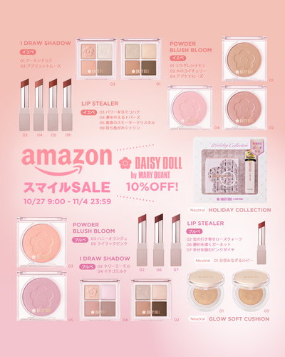 2025年11月4日(火)23:59まで、Amazon スマイルSALEでデイジードールが10%オフ!話題の新商品やメイクアイテムをお得にゲットできるチャンス♪期間限定のスペシャルプライスをお見逃しなく!