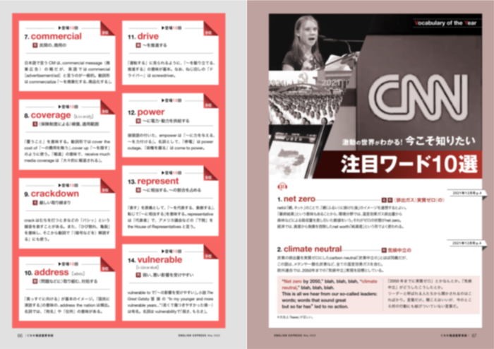 今月は、過去5年分のEEに登場した1万3000語以上の中から、選りすぐりの重要単語・語句を抽出した、EEならではの特集をお届け!!さらに、国際情勢・時事に関する「注目ワード10選」もご紹介します。「NFT」や「net zero」など、よく聞くけど何のことか正直わからない…なんて単語もばっちりカバーしています。今回登場する重要単語を押さえれば、ニュースを理解するのがぐっと楽になること間違いなし!この特集で語彙力を効率よく上げて、春のスタートダッシュを切りましょう。
