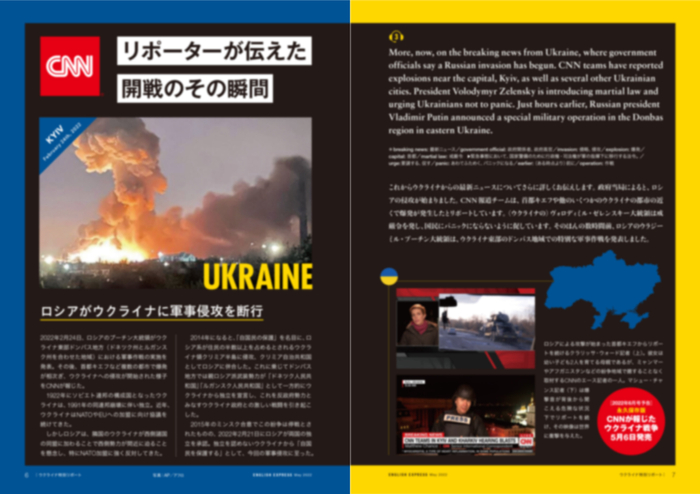 2022年2月24日、ロシアが隣国ウクライナ東部で軍事作戦を実施。その後、首都キエフなど複数の都市で爆発が相次ぎました。こうした現地の模様を、CNNはいち早く報道。ここでは、開戦当日の第一報を音声付きで取り上げています。