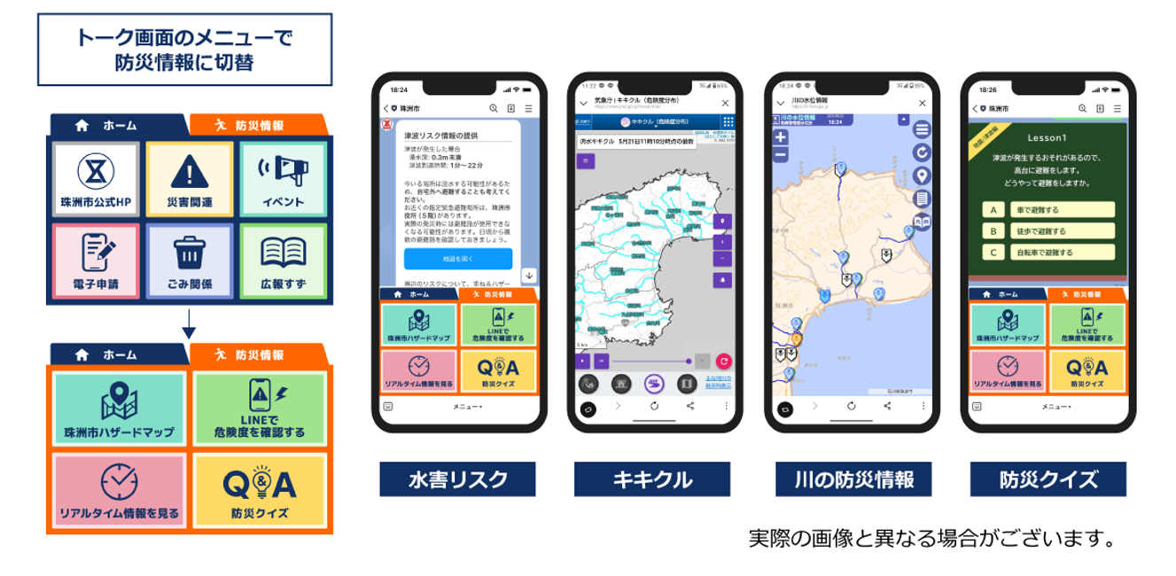 ・ハザードマップの水害リスク表示・・・GPS(位置情報サービス)の機能を利用し、津波、土砂災害、洪水のリスクをLINEのトーク画面に表示