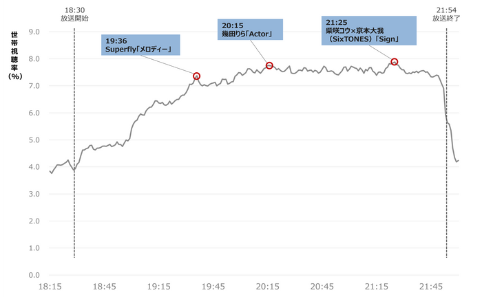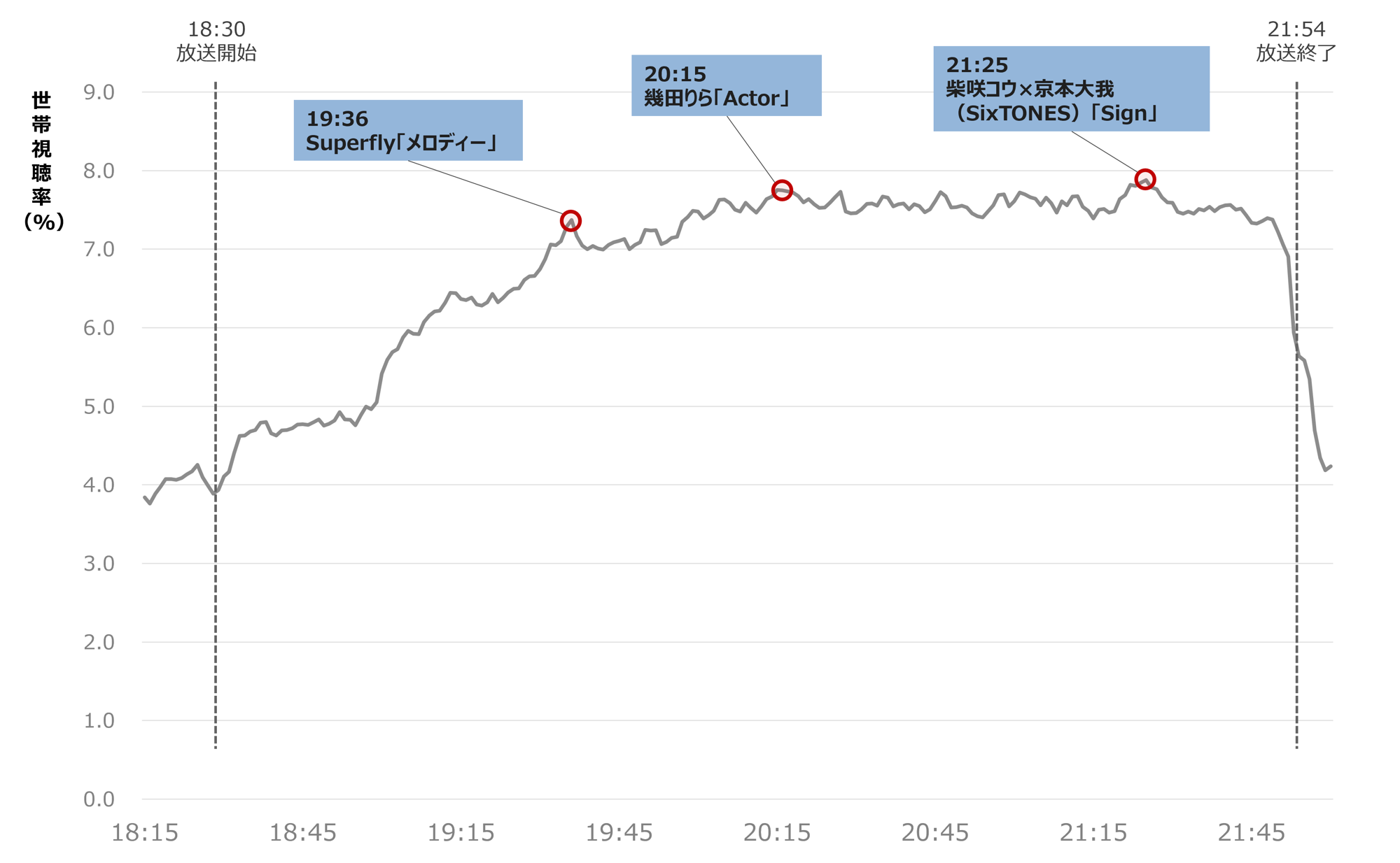 まず注目したいのは、19:33~19:36のSuperflyが玉置浩二の名曲バラード「メロディー」をカバーした場面です。歌唱が始まると視聴率も上向き、前半の山場をつくりました。