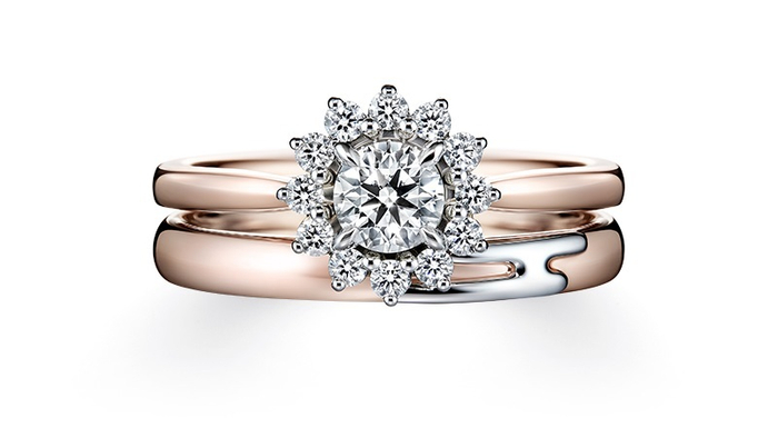新しい年の夜明けを昇る太陽を表した婚約指輪と、その空にたなびく霞をデザインした結婚指輪を重ねると、美しく幻想的な空の情景が指もとで完成します。繊細なアームに大きく輝くダイヤモンドとお揃いのピンクゴールドが、あたたかな個性を放つセットリングです。