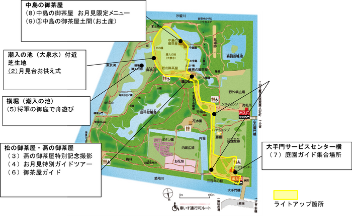内容:お月見に合わせて夜間園内をライトアップし、光と影で演出します。江戸湾に面した「濱御殿」の雰囲気をお愉しみください。