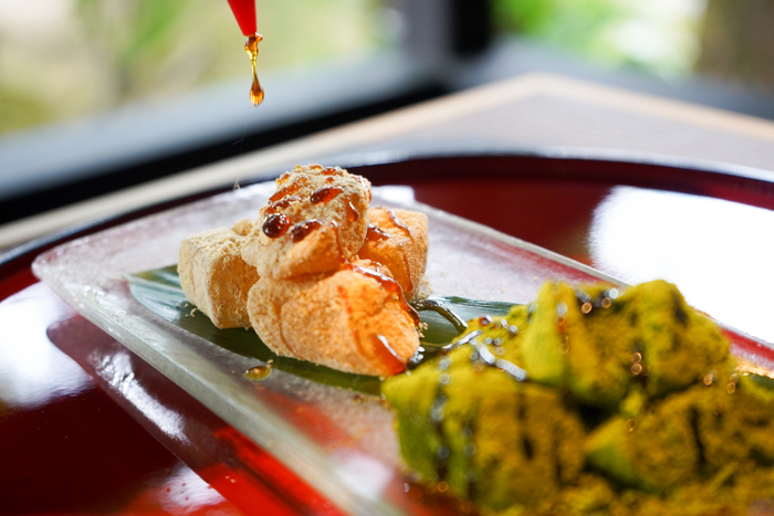 有機茶葉を使用した抹茶アイスに、京都発祥と伝わるほうじ茶のアイスもパフェに加え、京都らしい2つのお茶のアイスが融合。