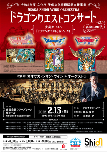 日本で最も長い歴史と伝統を誇る交響吹奏楽団の Osaka Shion Wind Orchestra を有する公益社団法人大阪市音楽団(本社:大阪市住之江区/理事長:石井徹哉)は、文化庁子供文化芸術活動支援事業(劇場・音楽堂等の子供鑑賞体験支援事業)の取り組みとして、2022年2月13日(日)に、市民会館シアーズホーム夢ホールにて開催いたします「ドラゴンクエストコンサート in 熊本」に、抽選で18歳以下の方160名様を無料でご招待します。