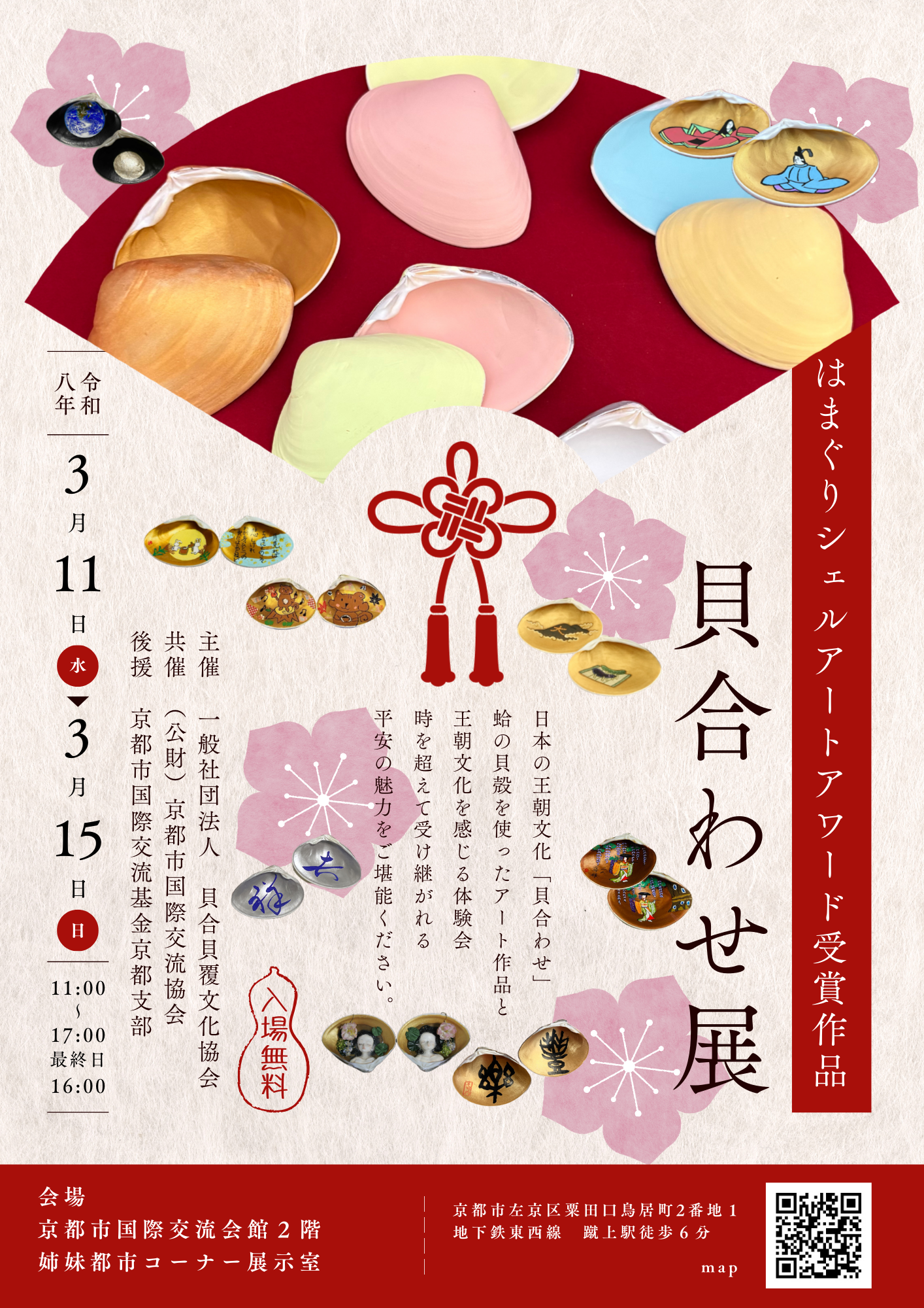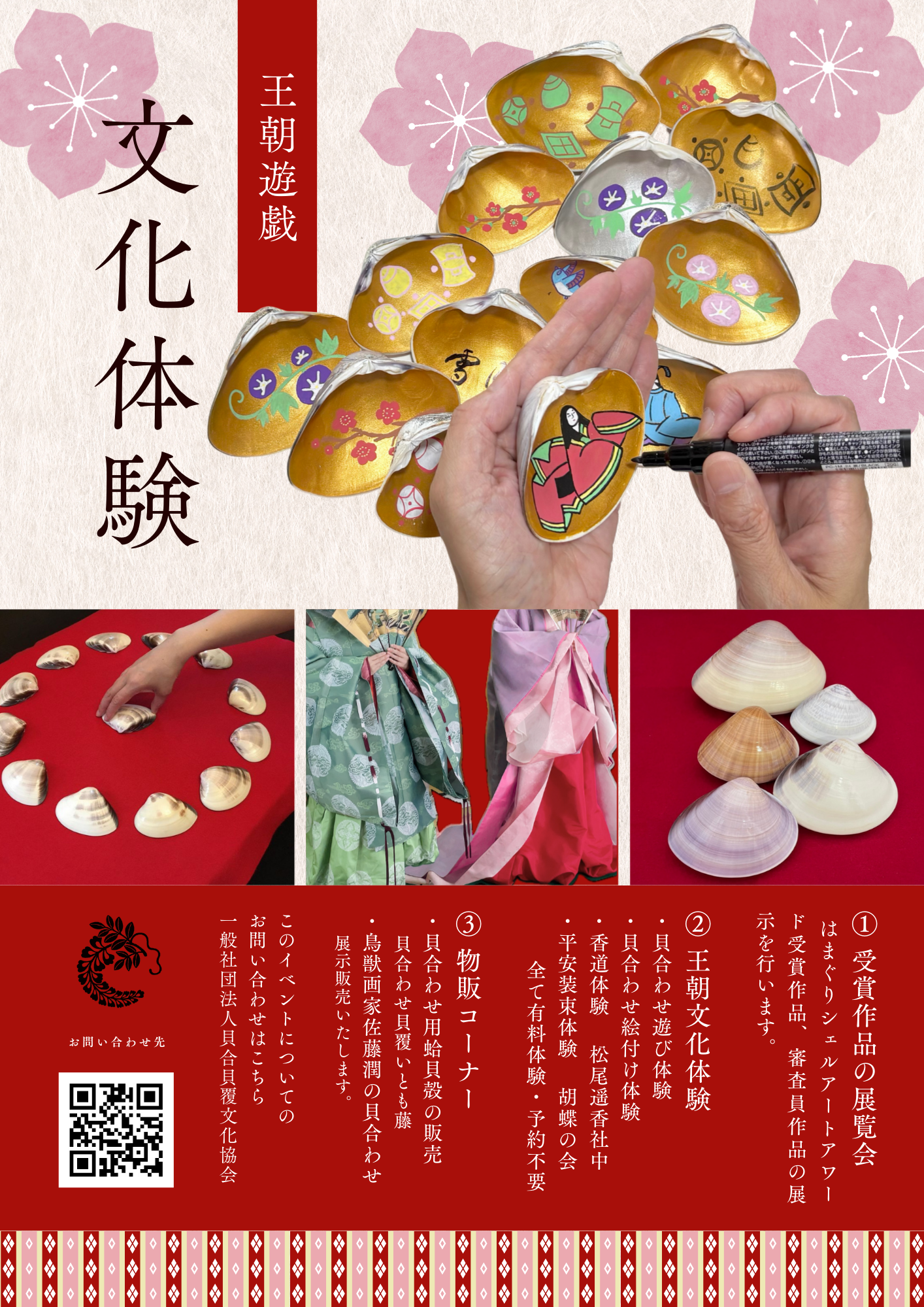 受賞作品の展示と、貝合せを伝えるイベント(絵付け体験、貝合せ遊び体験、香道体験、平安装束体験)を開催予定。