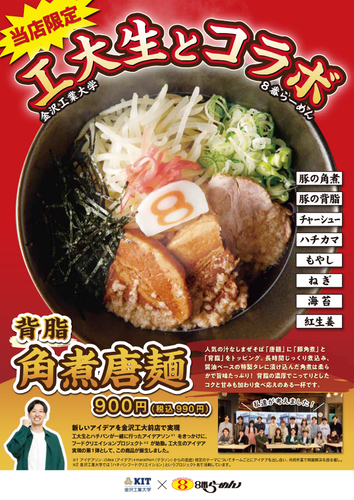 この限定メニューは、金沢工業大学と2022年6月から取り組んでまいりました「フードクリエイション・ハチバンプロジェクト」で企画・開発した商品で、1年間の活動を経て、この度、8番らーめん金沢工大前店グランドオープンに合わせて限定メニューとして発売いたします。