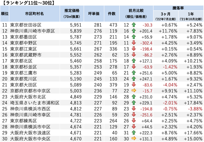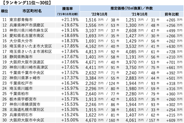 ※推定価格ランキングは2022年10月の販売件数が30件以上ある全国227市区町村、騰落率ランキングは2022年10月と2021年10月の販売件数がそれぞれ30件以上ある全国198市区町村が対象。