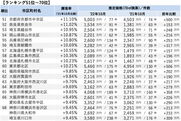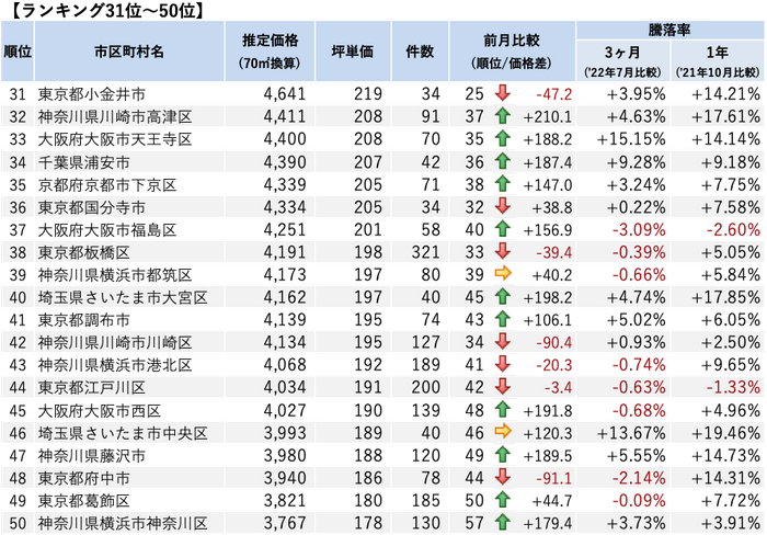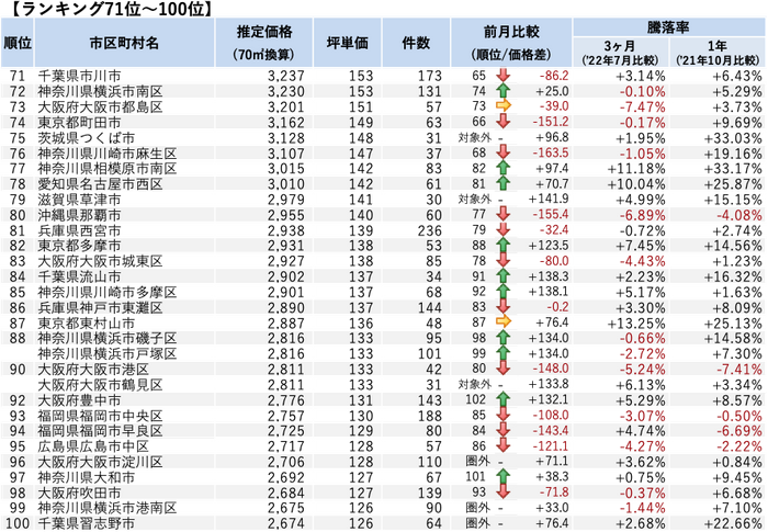 なお、3ヶ月前(2022年7月)と比較して価格が上昇したのは68市区、前月と比較して価格が上昇したのは63市区。