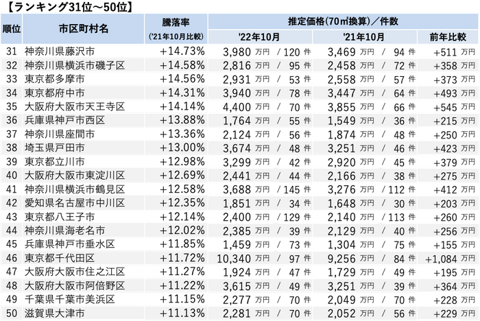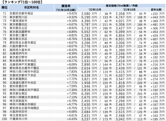 •100位以内の市区で、前年(2021年10月)と比較して価格が上昇したのは88市区。