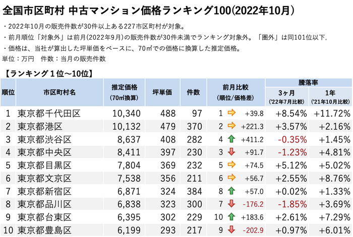 「マンションレビュー」2022年10月 全国市区町村 中古マンション価格/騰落率ランキング100を発表