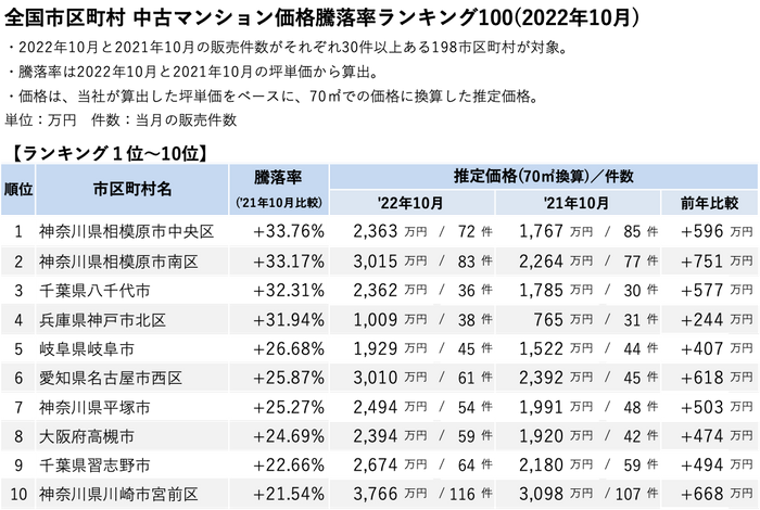 「不動産×WEB×ビッグデータ」の領域で、さまざまな不動産テックサービスを展開する株式会社ワンノブアカインド(本社:東京都港区、代表取締役社長:川島 直也、以下当社)は、当社が運営するマンション情報サイト「マンションレビュー」の保有データを元に、2022年10月の全国市区町村における中古マンションの相場を調査。坪単価をベースに70㎡での価格に換算した「中古マンション価格」*1および1年前と比較した価格の上昇率を表す「騰落率」のランキング100を発表いたします。