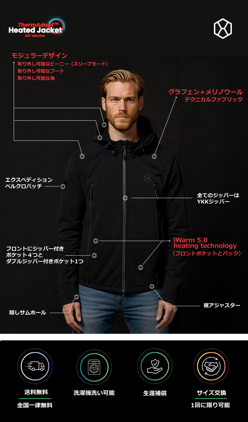 最新のAI温度制御テクノロジーと自由にパーツを着脱できるモジュラーデザインを融合し、さらに高伝導・高耐久を誇るグラフェン素材と、しなやかなメリノウールを組み合わせた、まさに「革新を纏うジャケット」