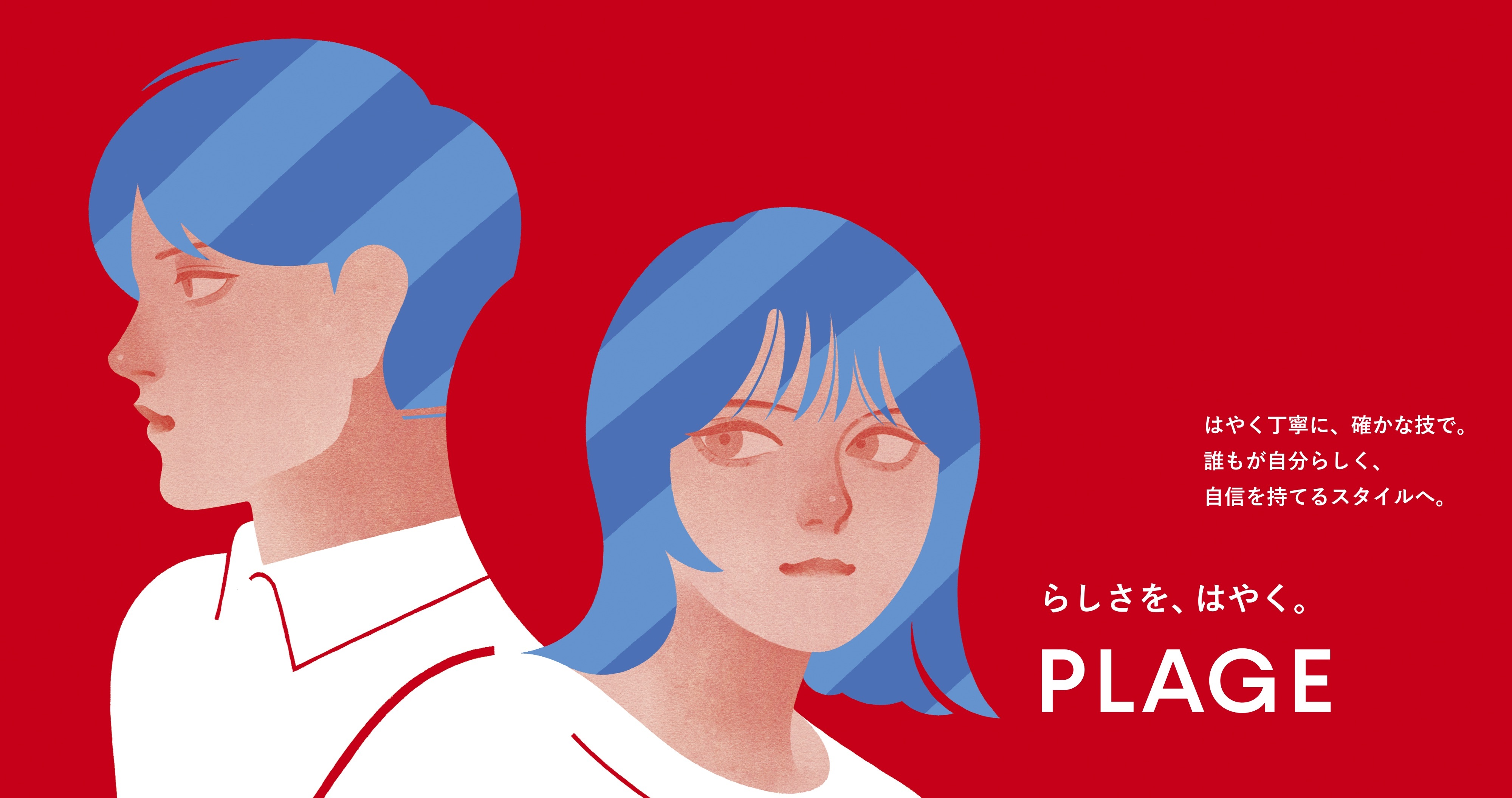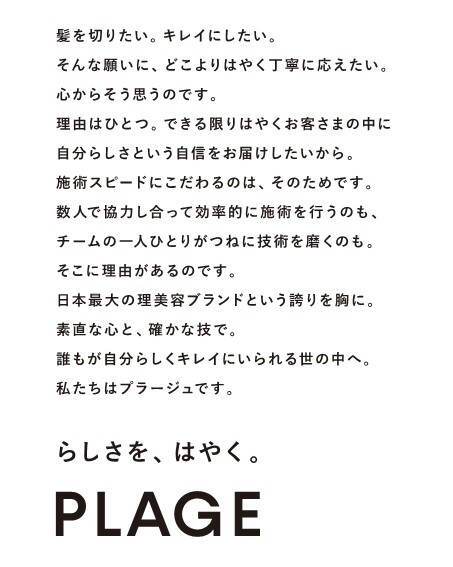 誰もが時間を大切にしている時代だからこそ、お客さまにとって「いちはやく自分らしく変われる場所」でありたいというPLAGEの思いを「らしさを、はやく。」という言葉で表現しました。