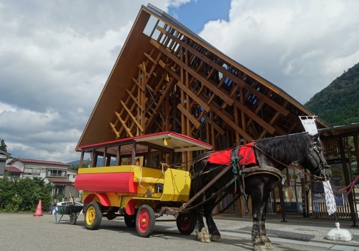 「湯っ歩の里発・もの語り館着」「もの語り館発・湯っ歩の里着」の2コースをご用意しています。いずれも片道20分程で、語り部による塩原の歴史や文化のお話に耳を傾けながら、温泉街の情緒あふれる風景を馬車から眺めることができます。こちらの温泉街ルートは4日間限定の運行になり、各回定員がございますので、昔乗ったことがある方も、一度も乗ったことがない方もお早めにご予約ください。