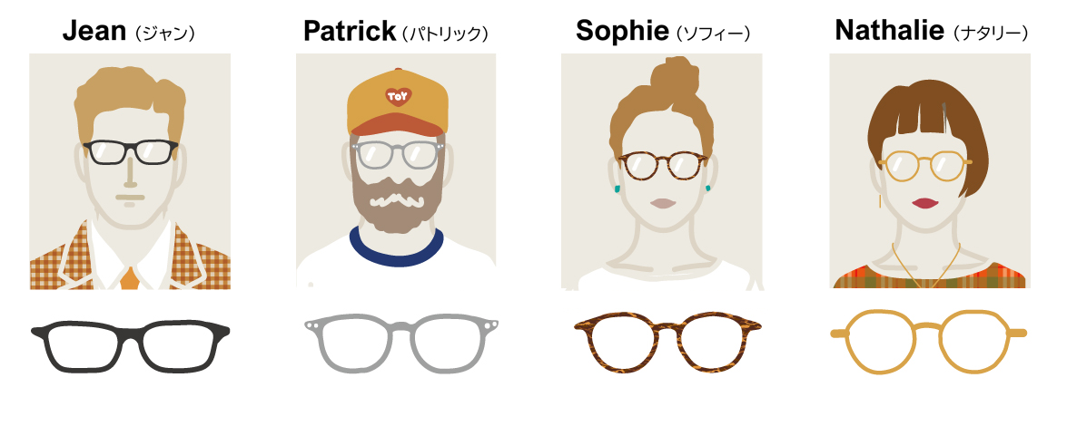 商品にはモデルごとに人物の名前を付け、キャラクターを設定。それぞれのキャラクターは、自分の好きなメガネを掛け、仕事や趣味を楽しんでおり、そのシーンをイメージしたイラストを各モデルのメガネクロスにプリントしています。