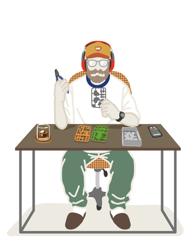 趣味のプラモデルに没頭中。フレームデザインはカジュアルにも使いやすいウェリントン型。