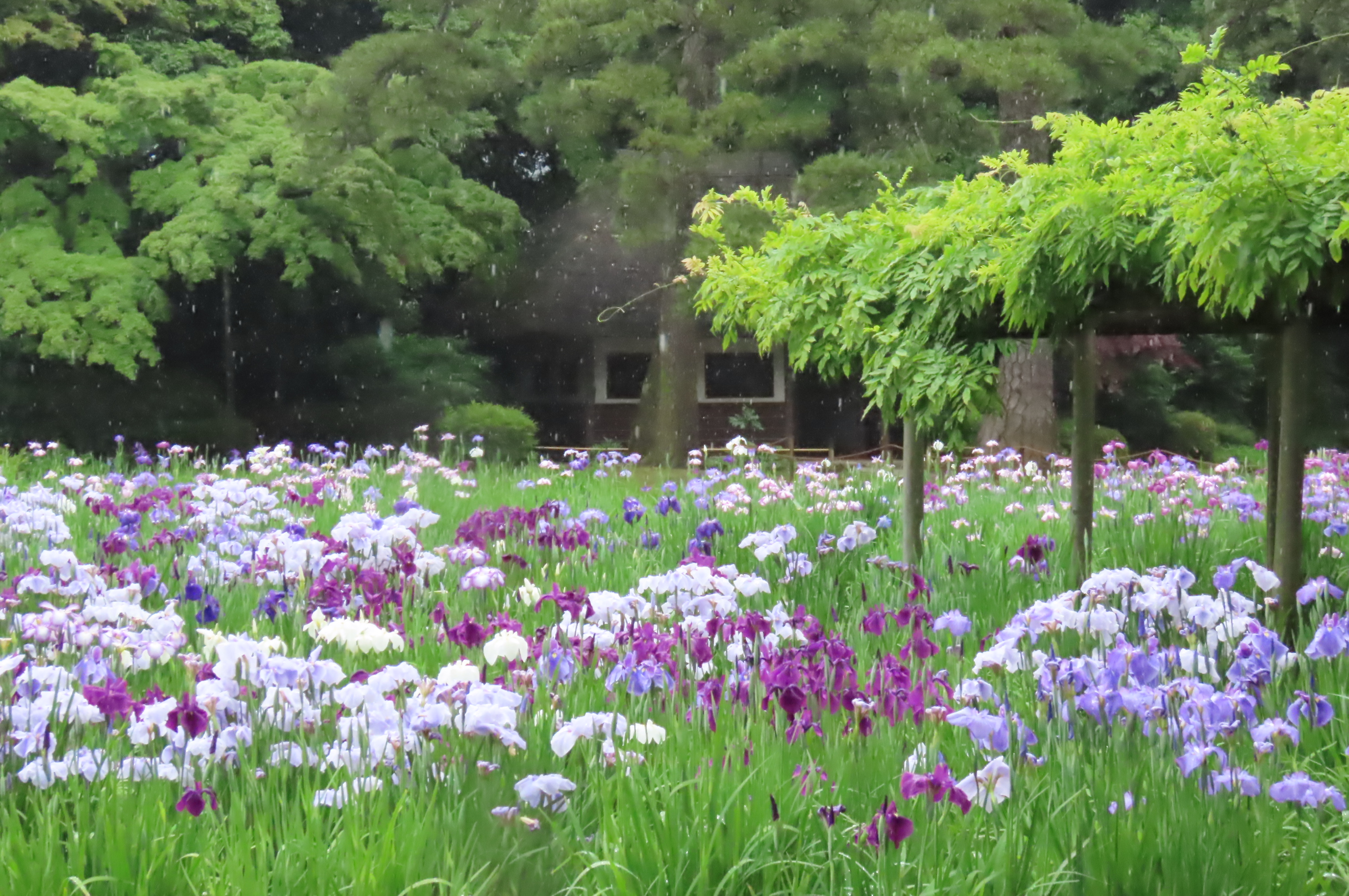 小石川後楽園の「花菖蒲田」では、現在約660株のハナショウブが咲きそろい、園内に涼やかな色彩を添えています。紫や白を基調とした江戸系の品種が中心で、静かな庭園に初夏の風情を演出しています。