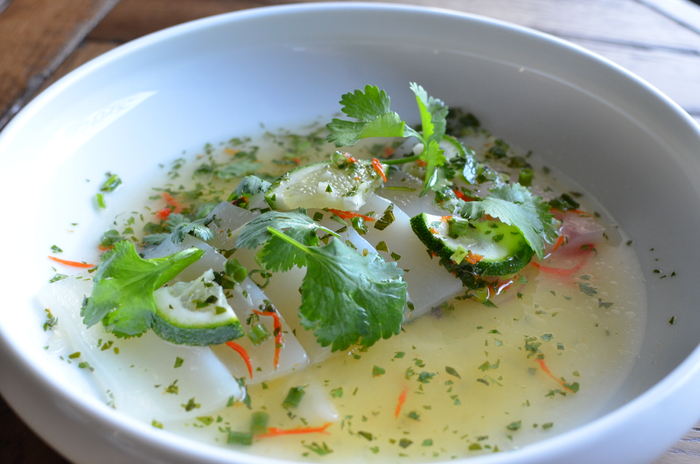 日本でも最大級の大イカは、冷凍することにより甘味やねっとりとした食感を持ち、とても美味しくなります。沖縄直送のカラマンシーは栄養価が高く美容や健康に良いとされております。甘辛くて酸味のある特製のカルパッチョソースでお召し上がりください。