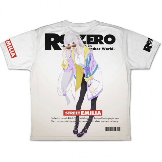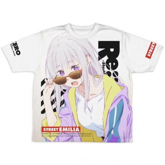 大きく描かれているのは、ストリートファッションに身を包んだエミリア。全体のデザインもオシャレでかわいいですよね♪こちらも、S/M/L/XLと4つのサイズを展開しています。