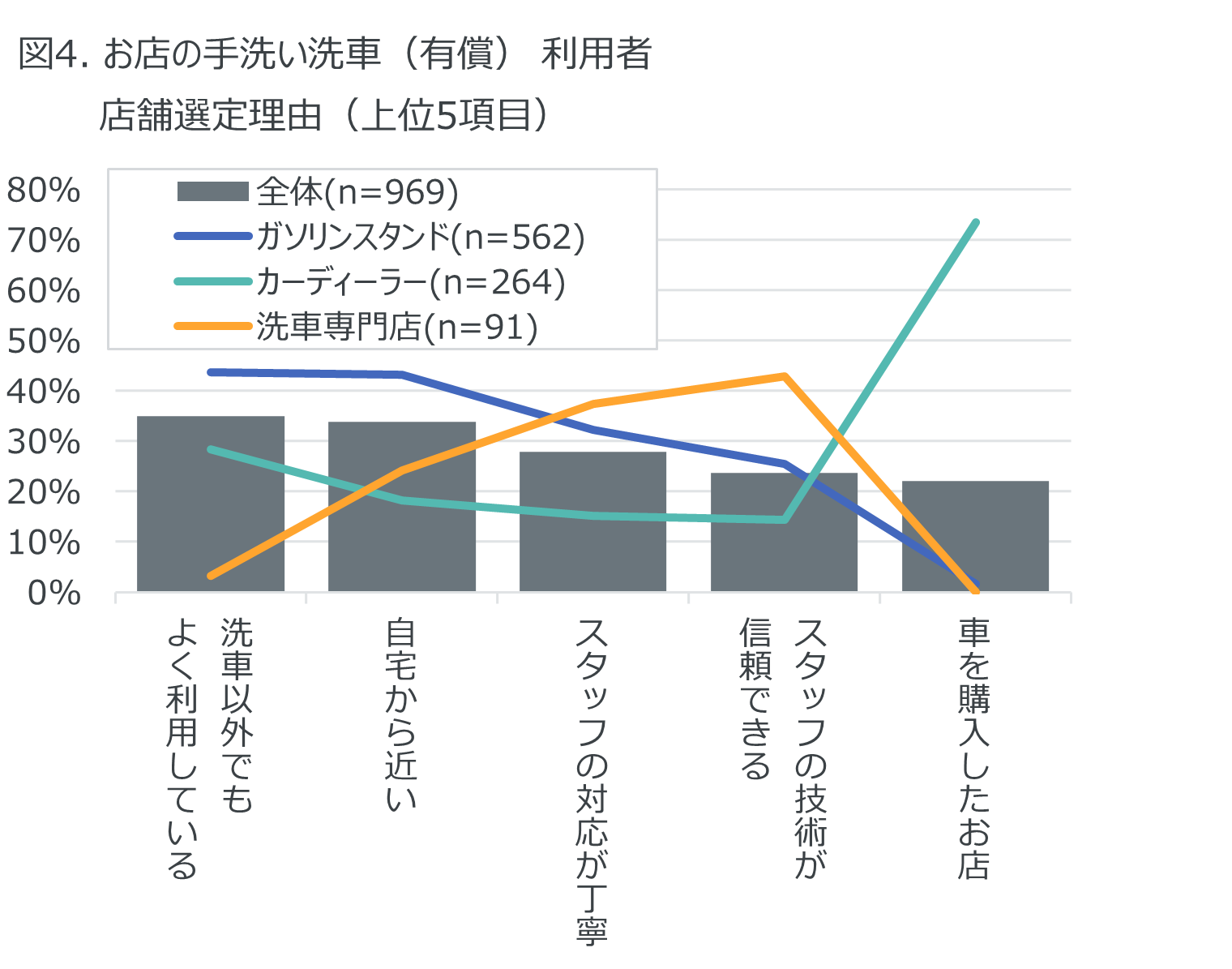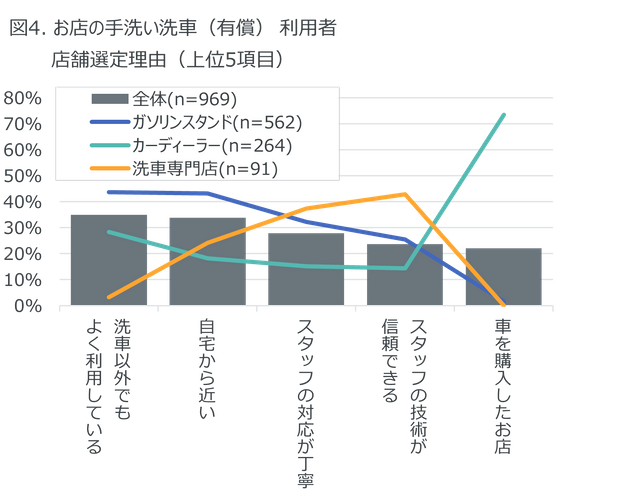 お店の手洗い洗車を利用する理由は「車全体をまとめてきれいにしてくれる」が55%と最多で、「いつもお願いしているお店/スタッフがいる」が30%と洗車技術を信頼し依頼している様子がうかがえる。利用店舗はガソリンスタンド(58%)に続き、カーディーラー(27%)、洗車専門店(9%)であった。その店舗に洗車を依頼した理由については、「洗車以外でもよく利用している(35%)」、「自宅から近い(34%)」が上位に挙げられた。(図4)。洗車専門店の利用者では「スタッフの技術が信頼できる」が最も高く43%であった。車に複数回コーティングを施工したことがある人では、主な洗車手段として「お店の手洗い洗車」を利用する人が17%に上り、車への愛着が高く、美観維持へのこだわりが強い様子が見受けられる。