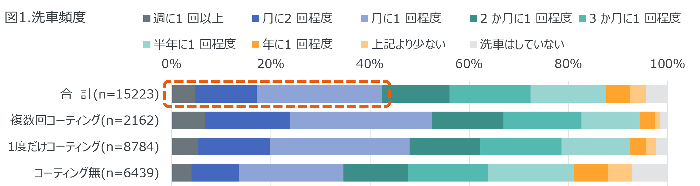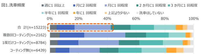 自動車保有者15,223人に対し洗車の頻度について調査したところ「月に1回程度」のペースで洗車をする人が最も多く25%を占め、月に1回以上洗車をする人は42%に上った(図1.オレンジ枠)。「3か月に1回程度」が16%、「半年に1回程度」が15%であった。車にコーティングをしている人は月に1回以上洗車をする割合が高く、購入時などに1度コーティングをした人では48%、複数回コーティングをした人では53%と愛車を綺麗に保ちたいという意識がうかがえる。洗車のきっかけでは「ボディの汚れが目立った」という回答が79%と圧倒的に多く、2番目の「前回から一定期間が経過」は19%、3番目の「フロントガラスの汚れが目立った」は16%に留まった。月に2回以上洗車をする人は「フロントガラスの汚れが目立った」が26%、「雨が降った後」が22%と車の汚れに対して敏感な様子が見られた。主な洗車手段については、自分で手洗いする人が49%、洗車機を利用する人が41%で両者を合わせて9割に至った。また、お店の手洗い洗車(有償)を利用する人は7%であった。