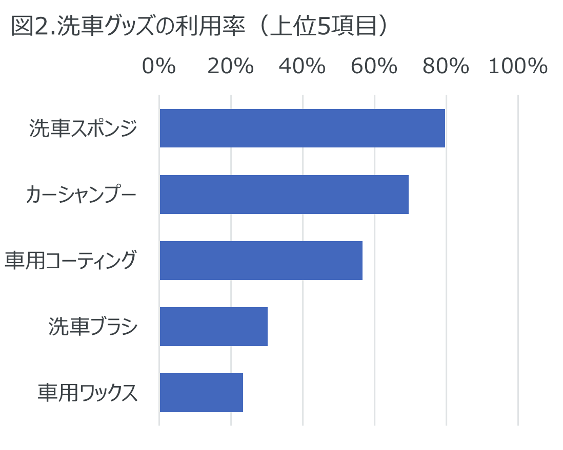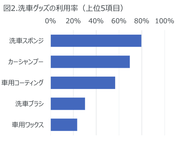 自分で手洗い洗車をする人の多くは自宅の駐車場や庭(86%)で行っており、洗車場を利用する人は9%であった。洗車時に使用する用品では洗車スポンジが80%、カーシャンプーが70%、車用コーティングが57%であった(図2)。カーシャンプーなどの用品を購入する際に参考にしている情報源は「インターネット上のレビューなど」が12%、「商品パッケージ」や「店頭の販促物」が10%、「YouTube動画」が8%であった。洗車頻度が多い人ほどインターネットのレビュー、YouTube動画を見る割合が高い傾向が見られ、よく使うアイテムだからこそ使用感を確認したいものと思われる。
