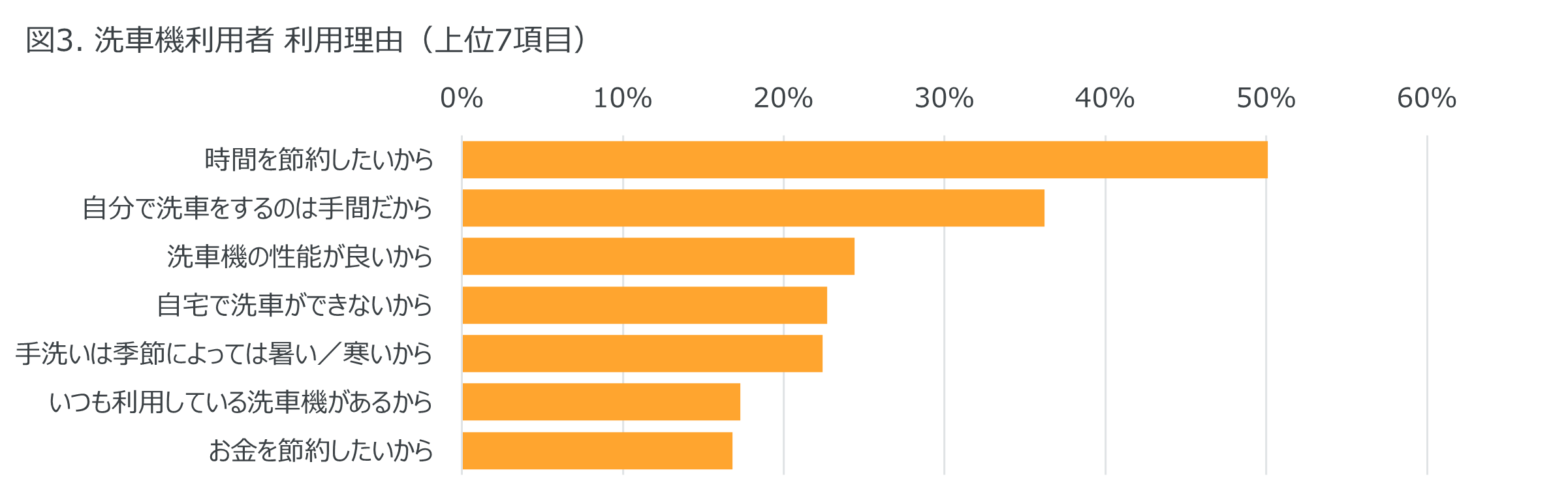 ・ 洗車機利用者は「時間の節約(50%)」と「手間の省略(36%)」を利用理由の上位に挙げた。