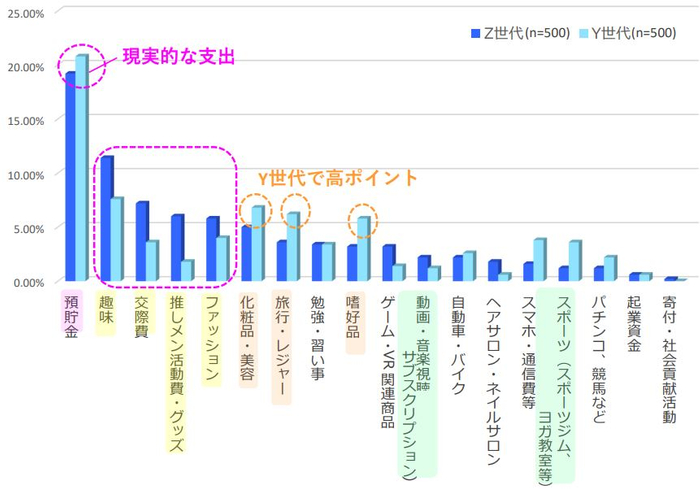 ・Z世代では、『預貯金』が最も高く、つづいて『趣味』、 『交際費』、『推しメン』、『ファッション』 の順となっている。