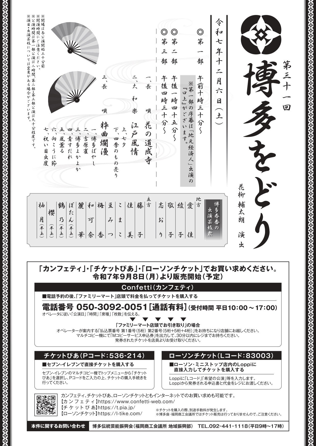 博多伝統芸能振興会(会長:谷川浩道・福岡商工会議所会頭)主催、『第三十一回博多をどり』が2025年12月6日(土)に博多座(福岡市博多区下川端町2-1)にて開催されます。