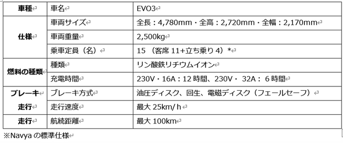 本車両は、Navyaのフランス・サン=ヴァリエ工場で製造され、最大15名(座席11名+立席4名)の乗客を輸送可能です。平均稼働時間は約10時間で、オペレーターなしで公道及び私有地での走行を実現します。