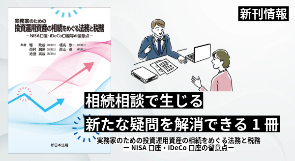 新日本法規出版株式会社(所在地:愛知県名古屋市中区、代表取締役社長:河合誠一郎)は、新刊『実務家のための投資運用資産の相続をめぐる法務と税務ーNISA口座・iDeCo口座等の留意点』(共著:堀政哉・橘髙悠一・西村潤帰・西山卓・池田真哉)を2026年4月22日(水)に発売いたしました!