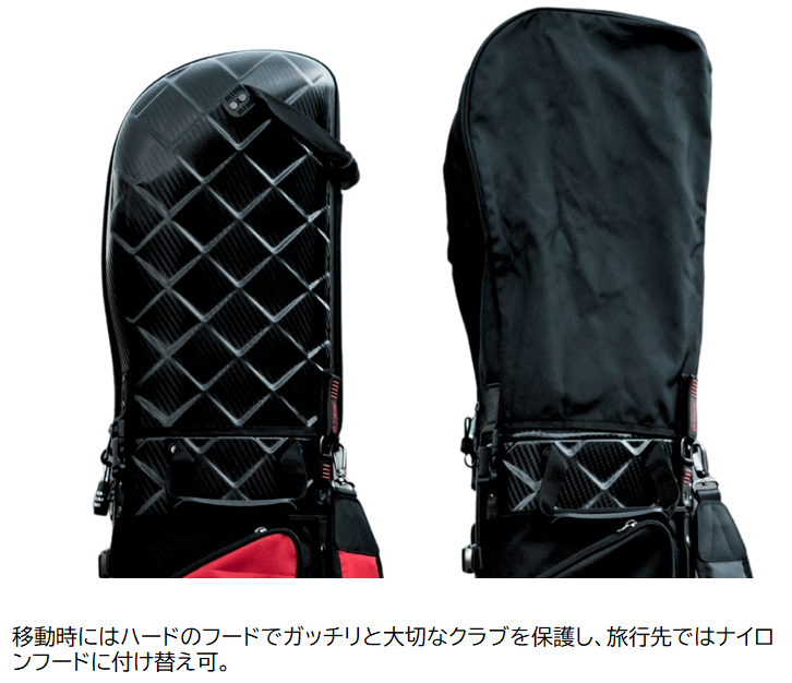 キャディバッグのボディはもちろん、フードもハードケースの仕様です。また、ナイロン製のフードも付属しており、旅先の宿で付け替えも可能です。