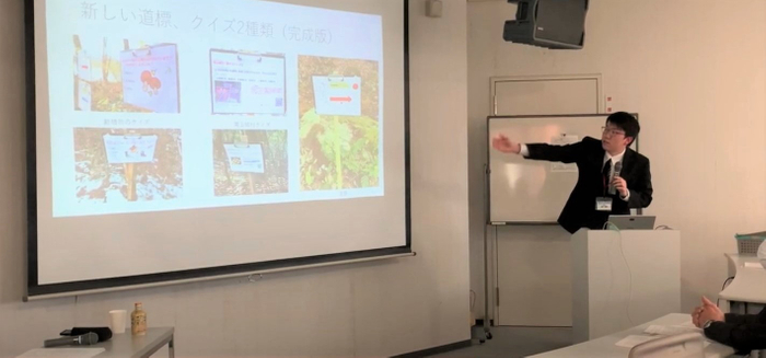 こうした今年度の取り組みについて、プロジェクトリーダーである3年生の中嶋海斗さんが報告を行いました。報告の中では先輩たちが開拓してきたウォーキングコースを活用しながら、新たな課題に向けて挑戦し様々な困難の中でも多くの方々に支えられて無事にプロジェクトを終えることができたと充実した様子で報告してくれました。また、2月に開催された京都府の大学・学生の力発揮推進事業 成果報告会での発表の様子について、同席した冨加見地域協働センター長から補足説明がありました。