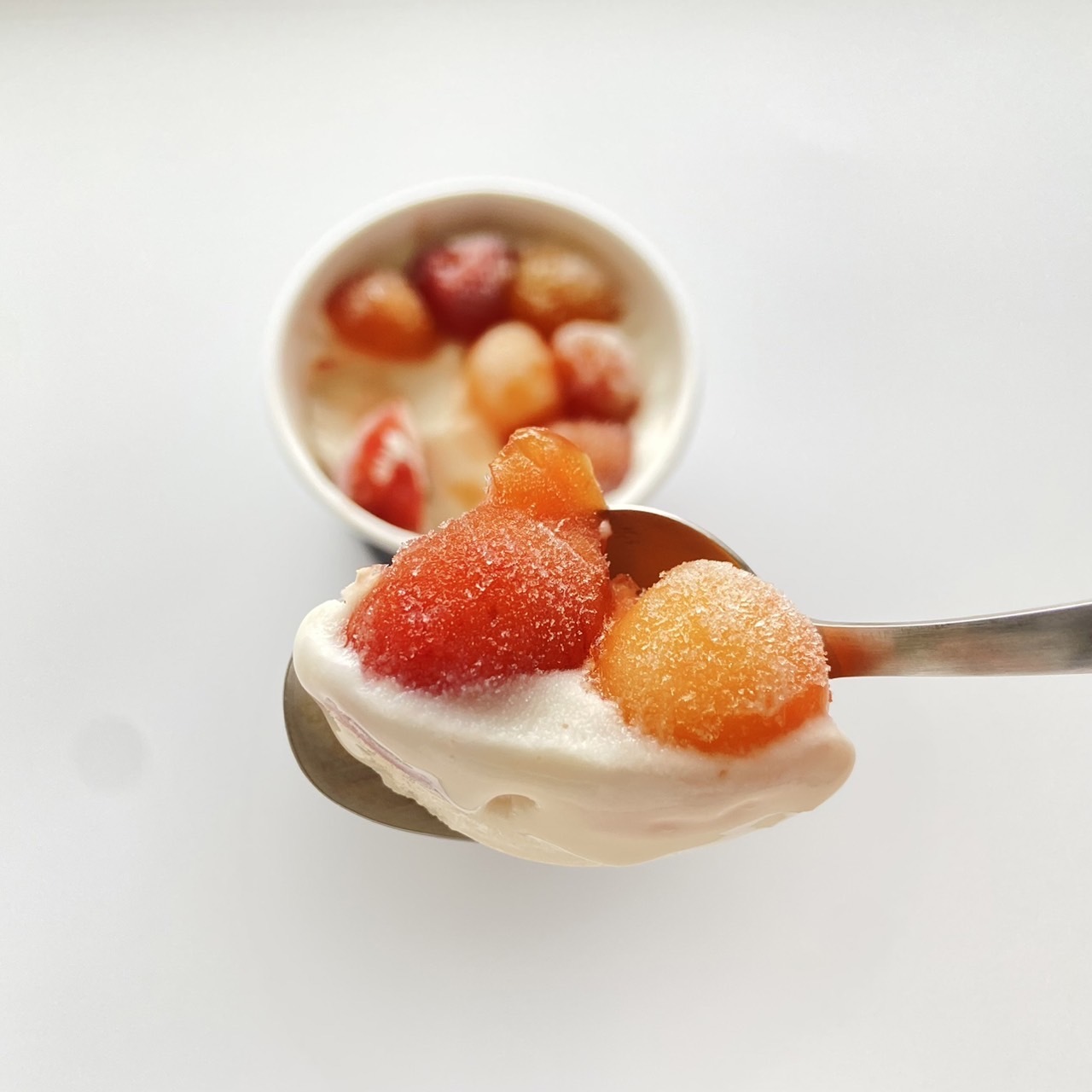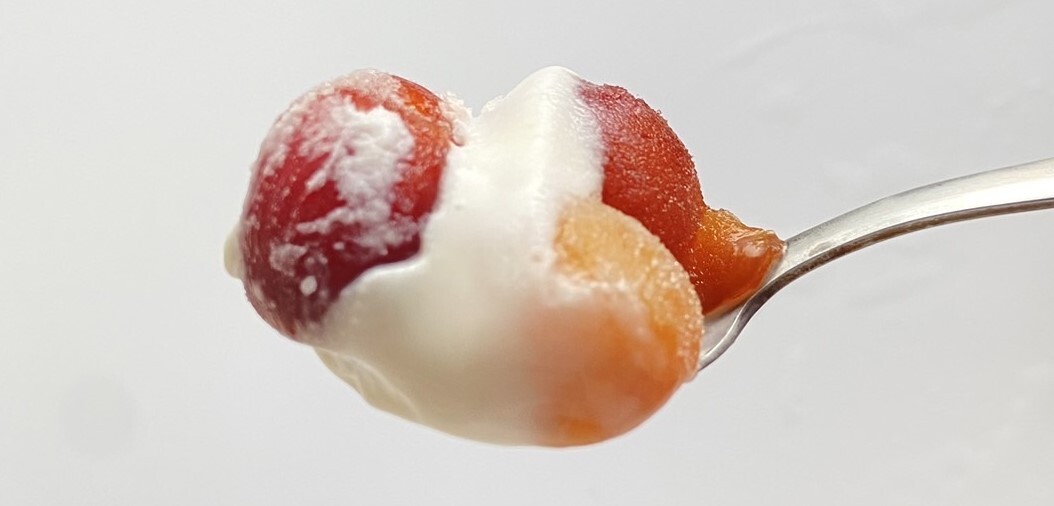 1口目は生に近い味わいのサクランボ、2口目はサクランボ果汁を使ったアイス、最後にサクランボとアイスを一緒に食べると今までにないアイスを味わえます。