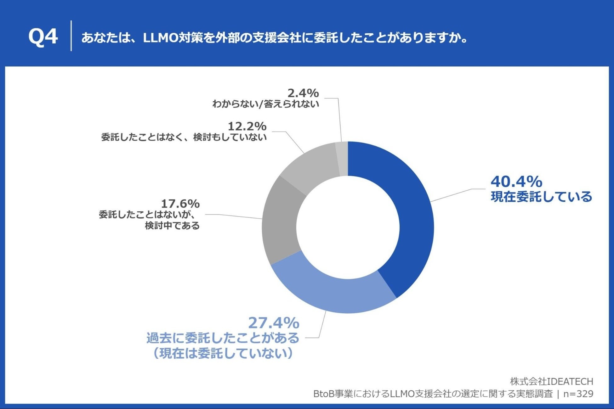 **Q4. あなたは、LLMO対策を外部の支援会社に委託したことがありますか。」**(n=329)と質問したところ、**「現在委託している」が40.4%、「過去に委託したことがある(現在は委託していない)」が27.4%**という回答となりました。