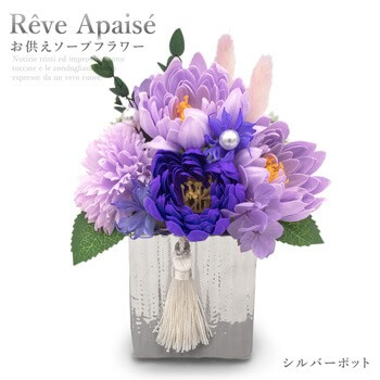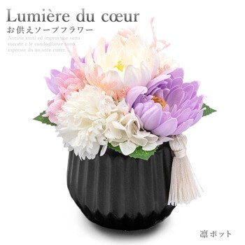 黒いポットに、白と淡い紫の菊をメインに、深い紫色のローズをアレンジした、高さ23cm×幅13cmほどのお供えソープフラワーです。