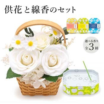 また、お供えソープフラワー電報にコンパクトサイズのお線香を添えたセット商品もご用意しております。