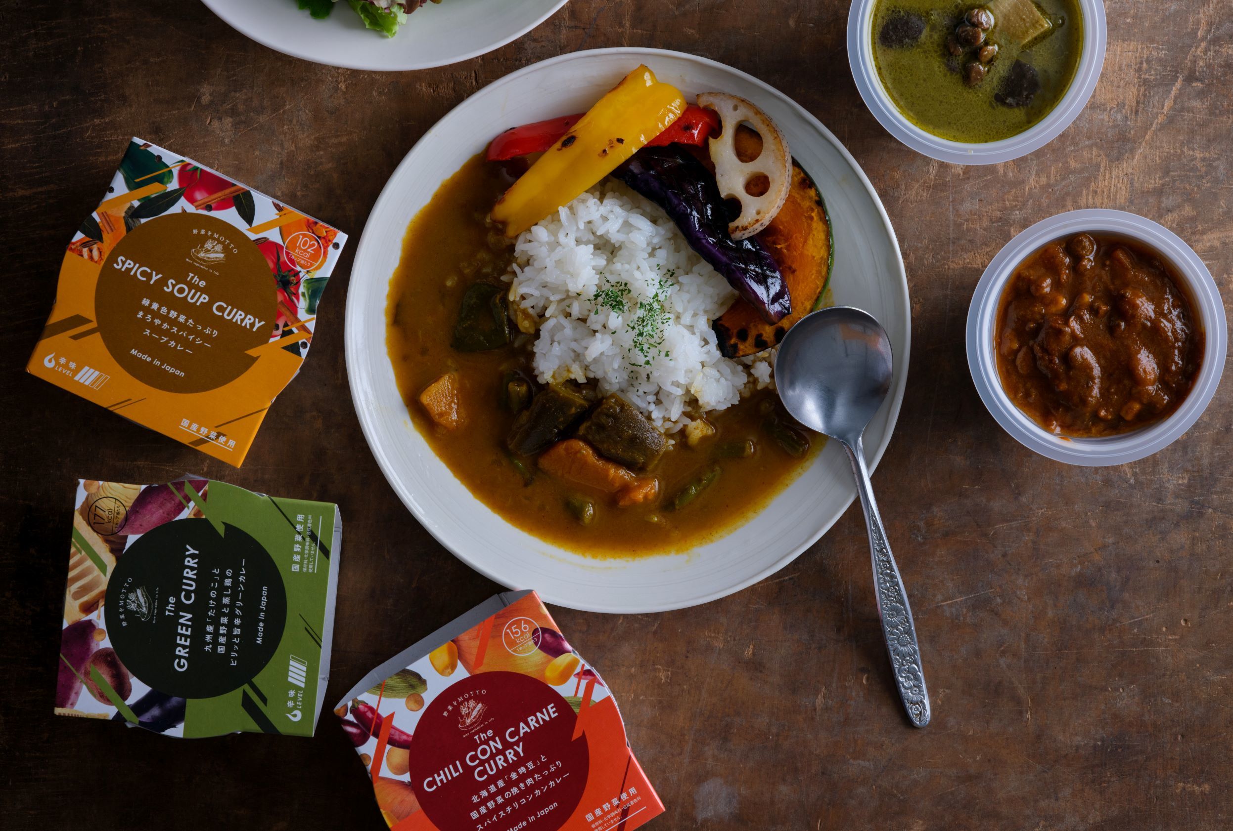 この度、「ベジMOTTO」内でも人気が高いカレーシリーズ第3弾として、「緑黄色野菜たっぷりまろやかスパイシースープカレー」が新登場。国産のかぼちゃ、なす、インゲン、ピーマンなどをたっぷり使用し、ゴロっとした具材は食べ応え抜群。動物性のエキスを使用せずオニオンソテーとマンゴーピューレを使用し、野菜のうま味をじっくりと引き出したカレーは、マイルドな辛さが食欲をそそる商品となっています。