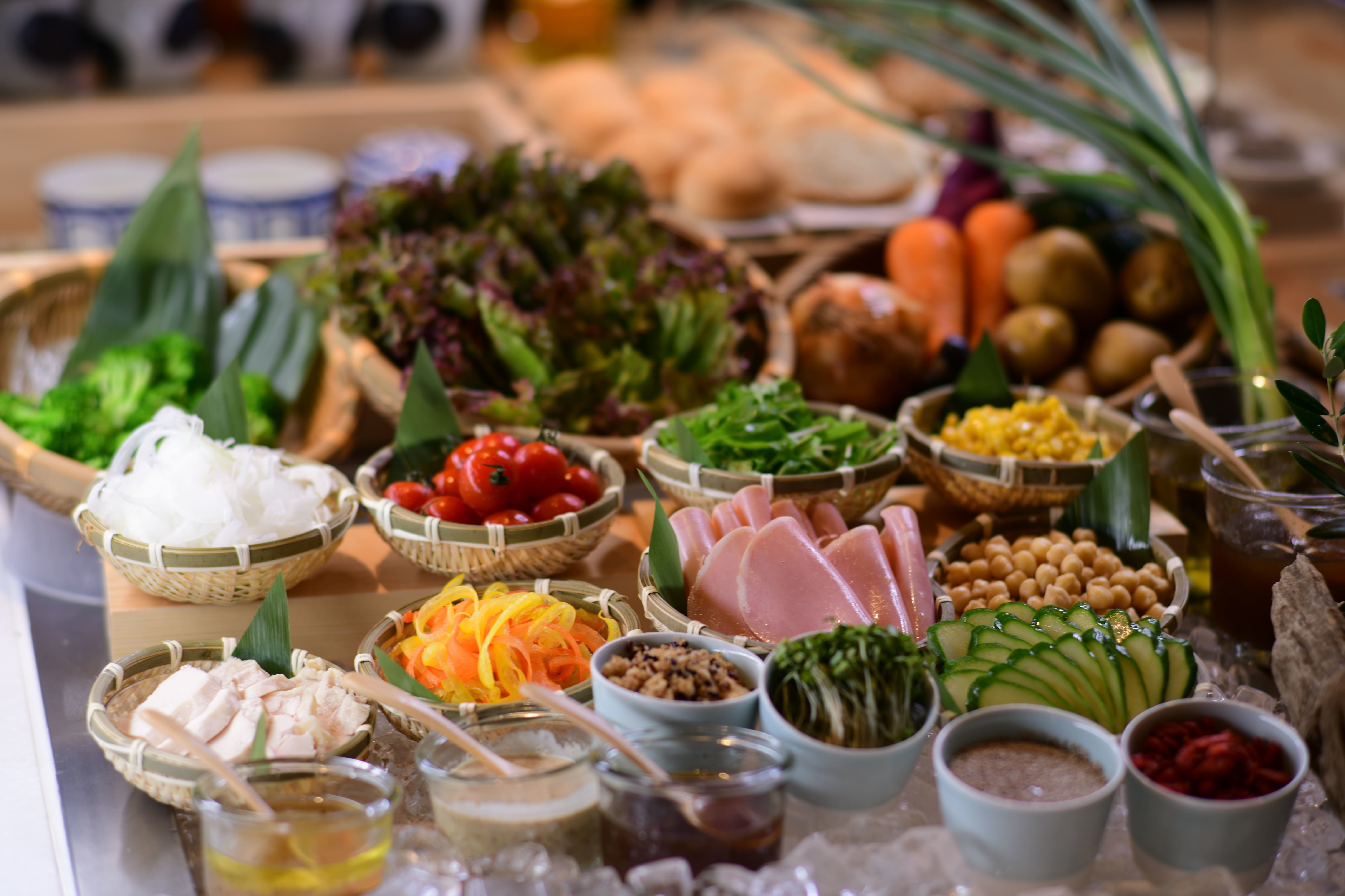 朝食も、蒸しかまどで炊いた、炊きたての自家製米を堪能でき、健康に配慮したビュッフェをご用意。