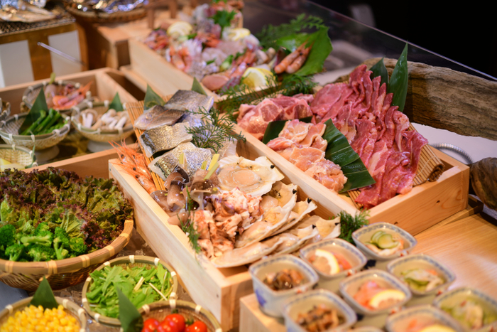 全席テーブル席であり、広い空間に1テーブルごと間隔を空けて配置をしておりますので、安心安全に、ゆったりとお食事をお楽しみいただけます。また、物見遊山内には、大型の蒸し器も設置されており、お客様が選んだ食材を目の前で蒸しあげてご提供する「ICHIJO 地獄蒸し」では、大量の蒸気が立ち上がる非日常の演出もご体験いただけます。