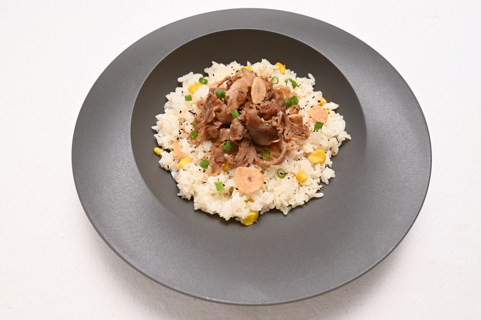 プルコギのたれとガーリックの香ばしい香りが食欲をそそる、ごちそうライス。「カルローズ」を使うことで、最後までパラパラとした軽い食感を楽しめます