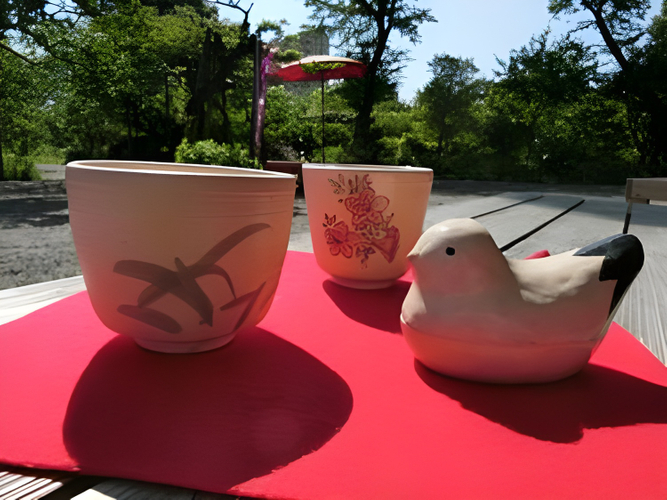 素焼きの陶器に絵付けをしていただき、園内をご覧いただいている間に窯で焼き付けます。