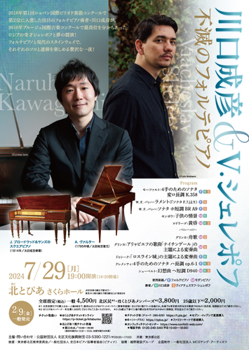 北区文化振興財団主催、『川口成彦 & V.シェレポフ 不滅のフォルテピアノ』が2024年7月29日 (月)に北とぴあ さくらホール(東京都北区王子1-11-1)にて開催されます。