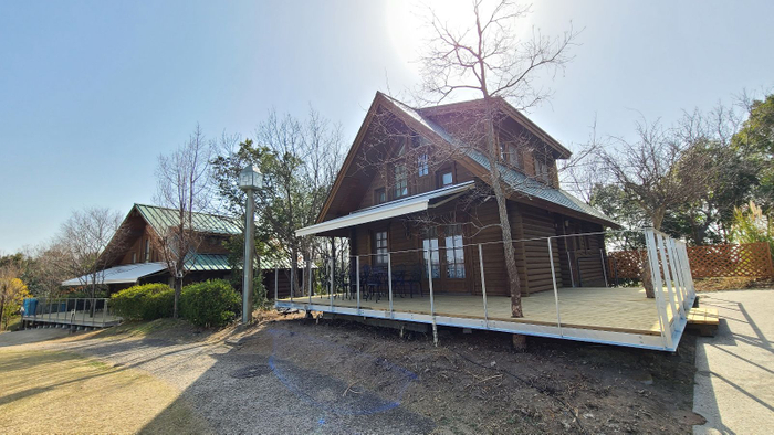 森のあちこちにはアメリカ、カナダ、フィンランド、スウェーデンの4カ国から輸入したログハウスがあり、大阪市内では希少な本物のログハウス体験ができます。
