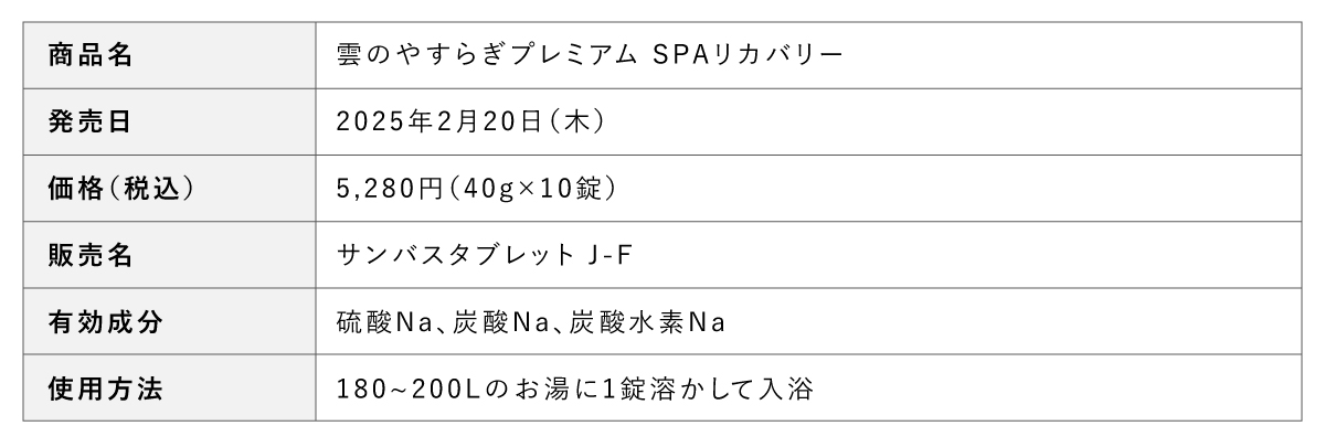 『雲のやすらぎプレミアム SPAリカバリー』は、有効成分「硫酸Na」「炭酸Na」「炭酸水素Na」を配合し、温浴効果を高めることで、日々の疲れを癒すことを目的としています。