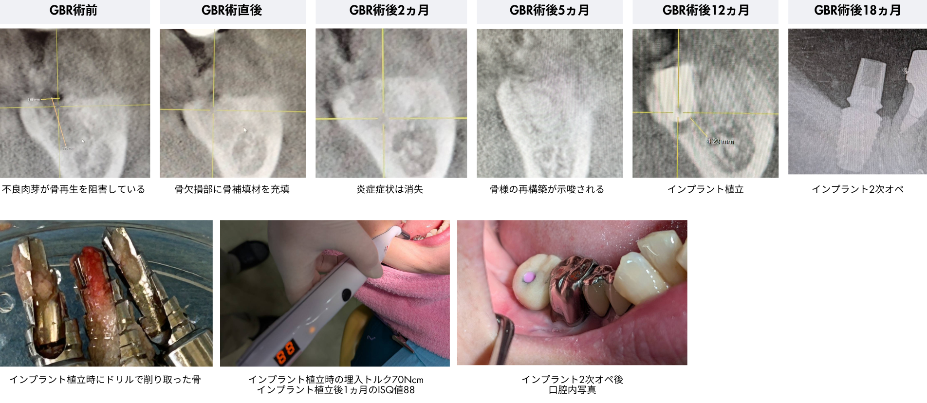 GBRオペレーション2年前に抜歯したNo.47の抜歯窩治癒不全で骨欠損が生じていた。プロービングデプスが12㎜あり、骨欠損部に炎症性不良肉芽を認めた。抜歯一年ほど前に骨粗しょう症薬ビスフォスフォネートを静注していたため破骨細胞の働きが抑制され、新しい骨の再生がすすまなかった。