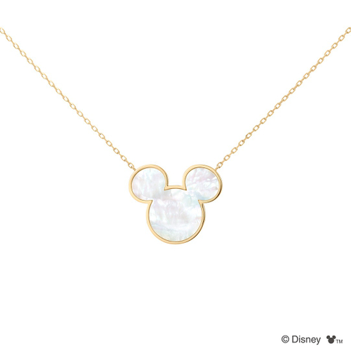「ミッキー」のアイコンをかたどったマザーオブパールがエレガントにきらめくネックレス。ペンダントトップ部分は縦が1.8cmほどの大きさで、貝ならではのつややかな光沢をしっかりと楽しめます。